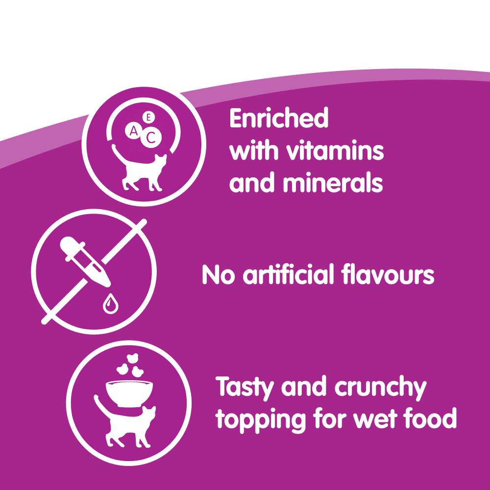 - Simply sprinkle on top of Whiskas wet food for a tasty and crunchy topping.